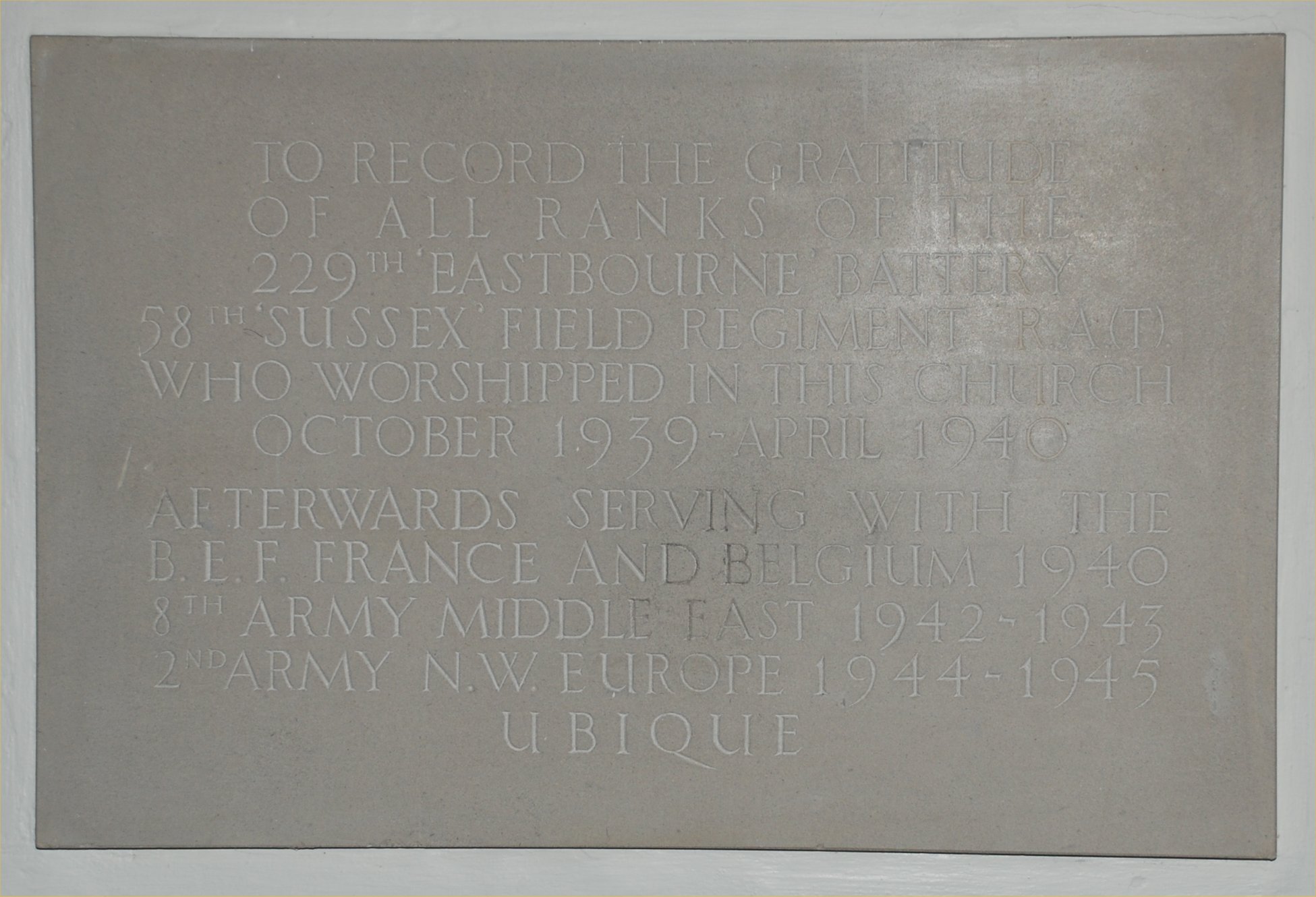 To record the gratitude of all ranks of the 229th Eastbourne Battery 58th Sussex Field Regiment R.A. (T) who worshipped in this church October 1939-April 1940 afterwards serving with the B.E.F. France and Belgium 1940 8th Army Middle East 1942-1943 2nd Army N.W. Europe 1944-1945 Ubique