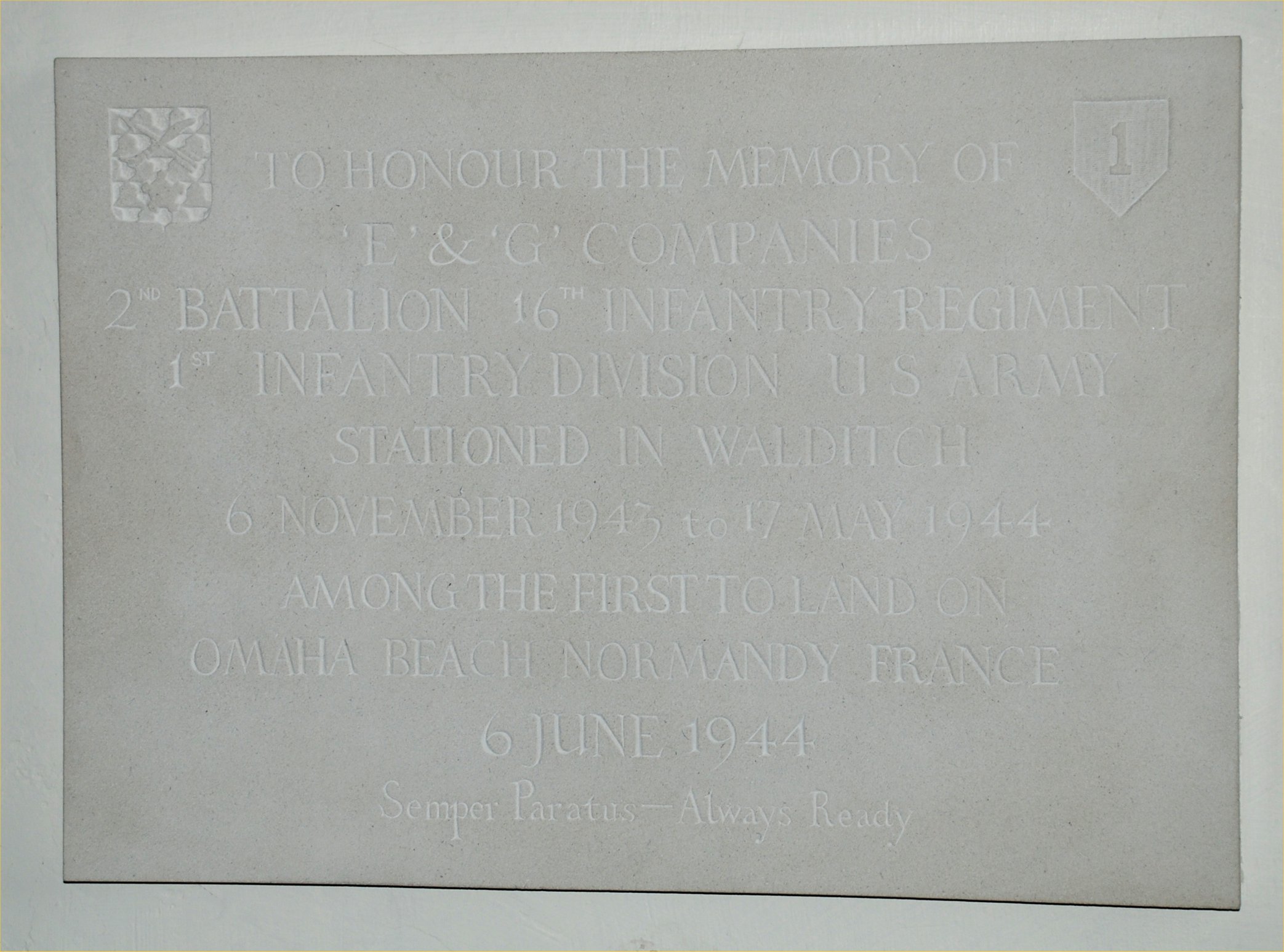 To honour the memory of 'E' & 'G' companies 2nd Battalion 16th infantry Regiment 1st Infantry Division U.S. Army stzationed in Walditch 6 November 1943 to 17 May 1944 among the first to land on Omaha Beach Normandy France 6 June 1944 Seper Paratus-Always Ready