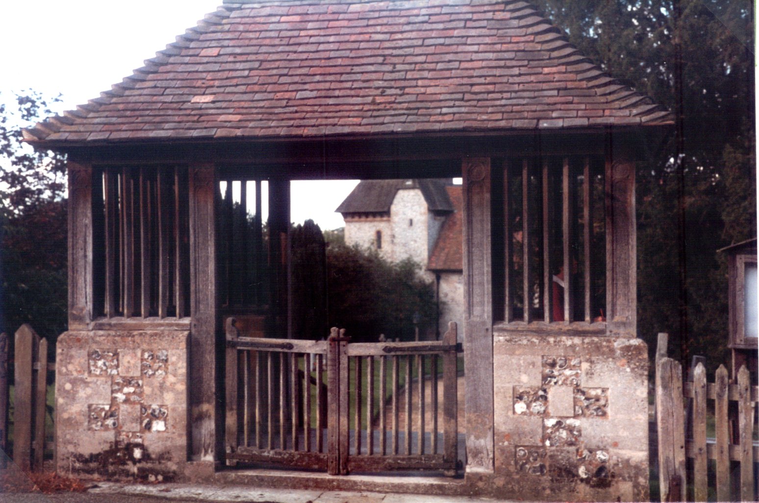 2 copper/brass Plaques on upright each side inside lytch gate to church with inscription outside above gate.