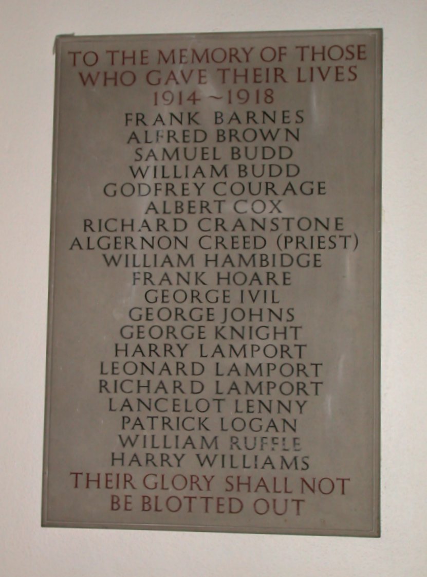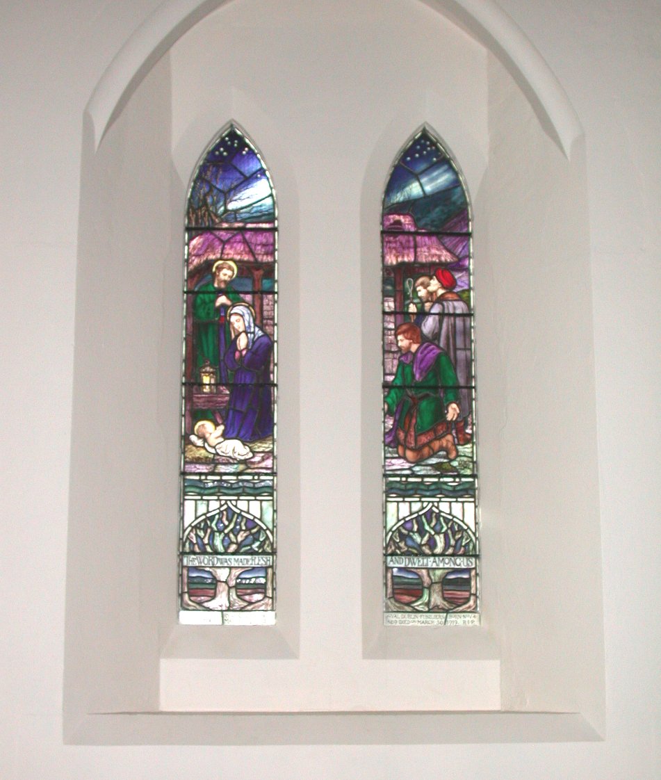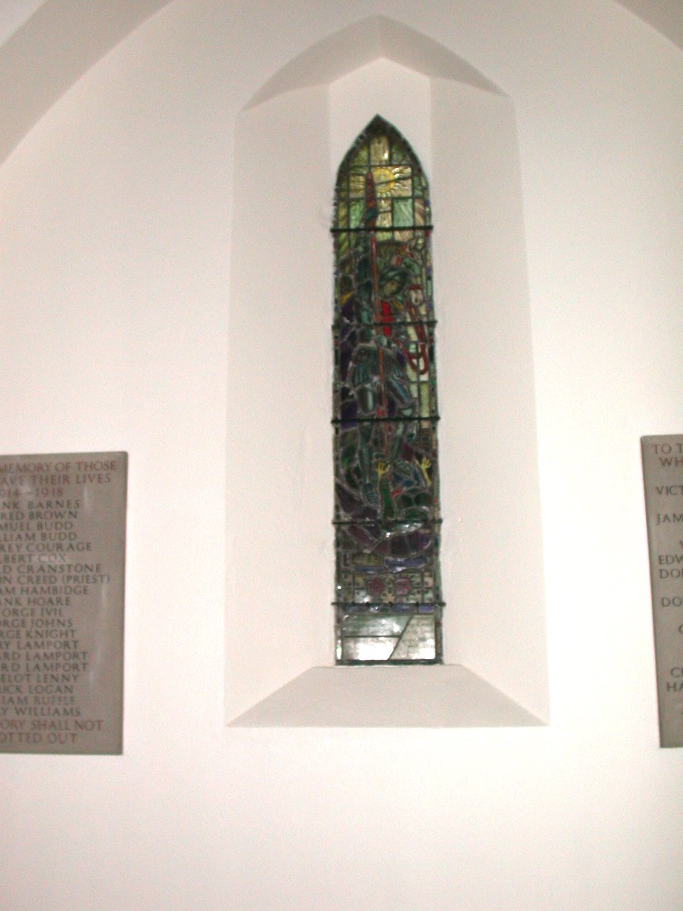Window in St Mary's Church flanked by WW1 & WW2 stone plaques, inscription at bottom of window.