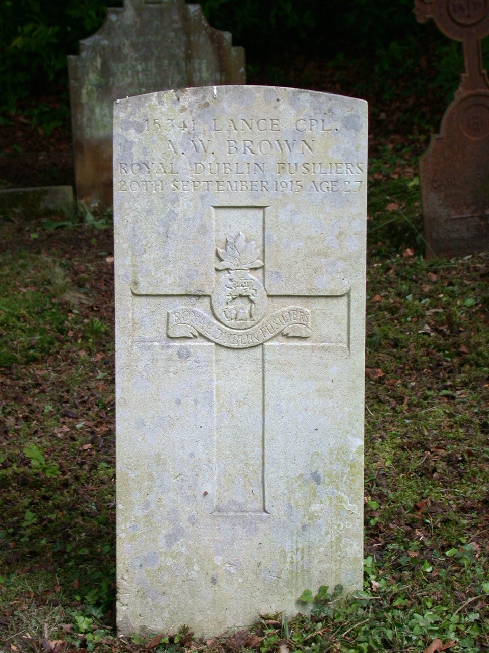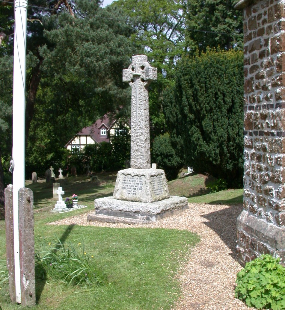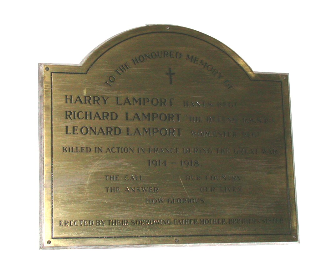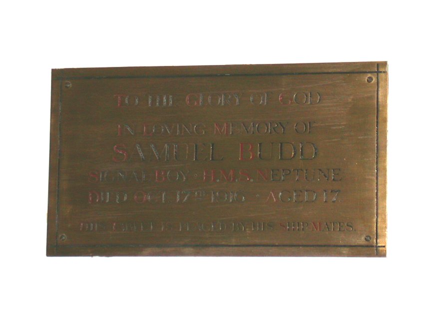 Window in St Mary's Church flanked by WW1 & WW2 stone plaques, inscription at bottom of window.