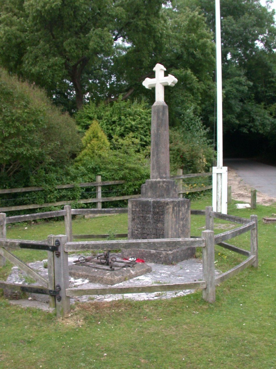 Stone cross on village green.
