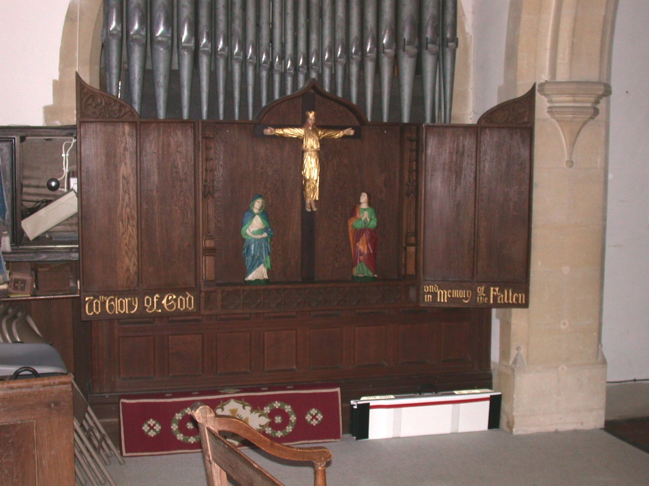 Wooden shrine at side of organ in Church.