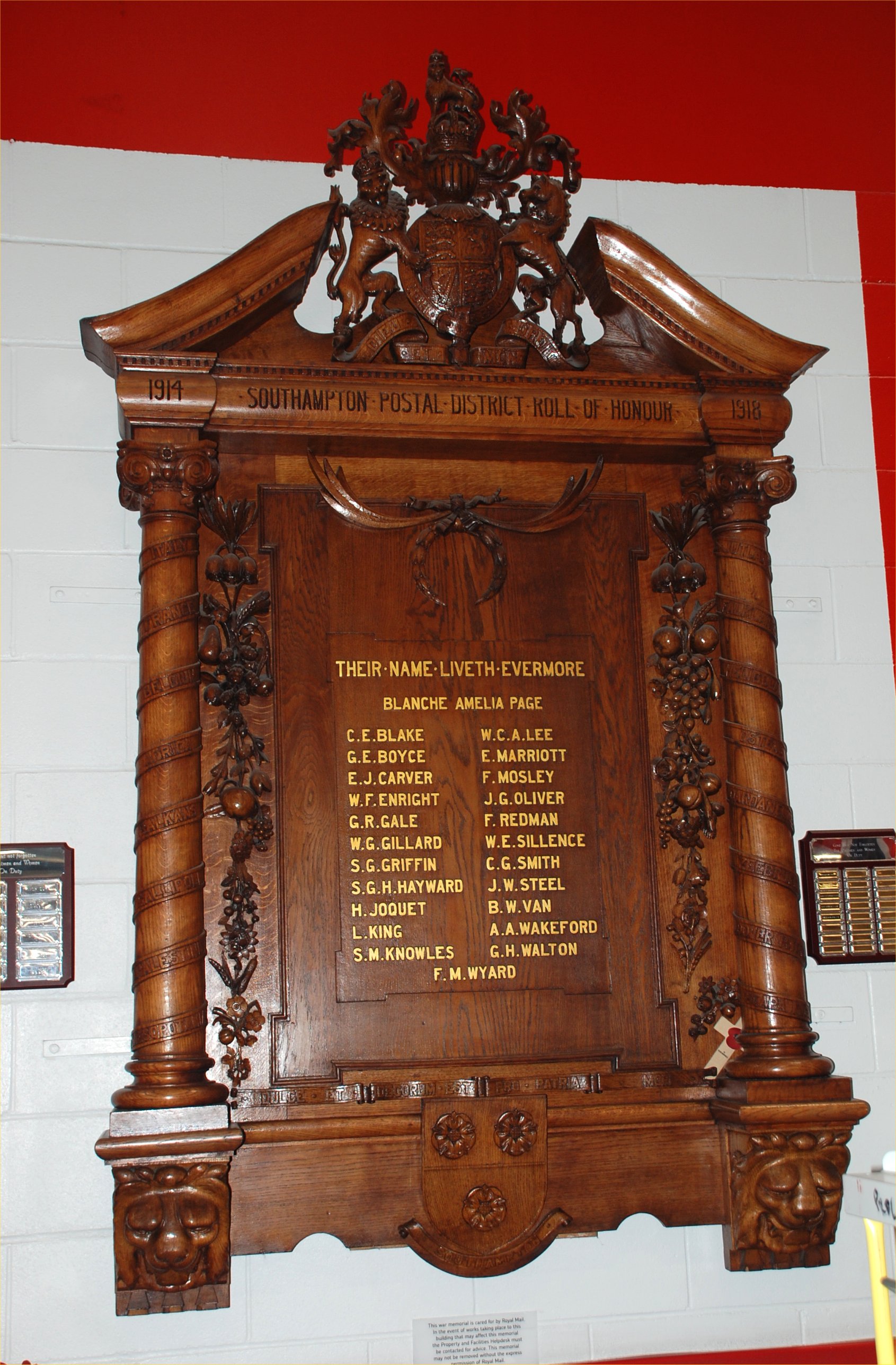 Large wooden plaque now in sorting area at Southampton Sorting Office (Eastleight Airport) originally in office in Southampton High Street.