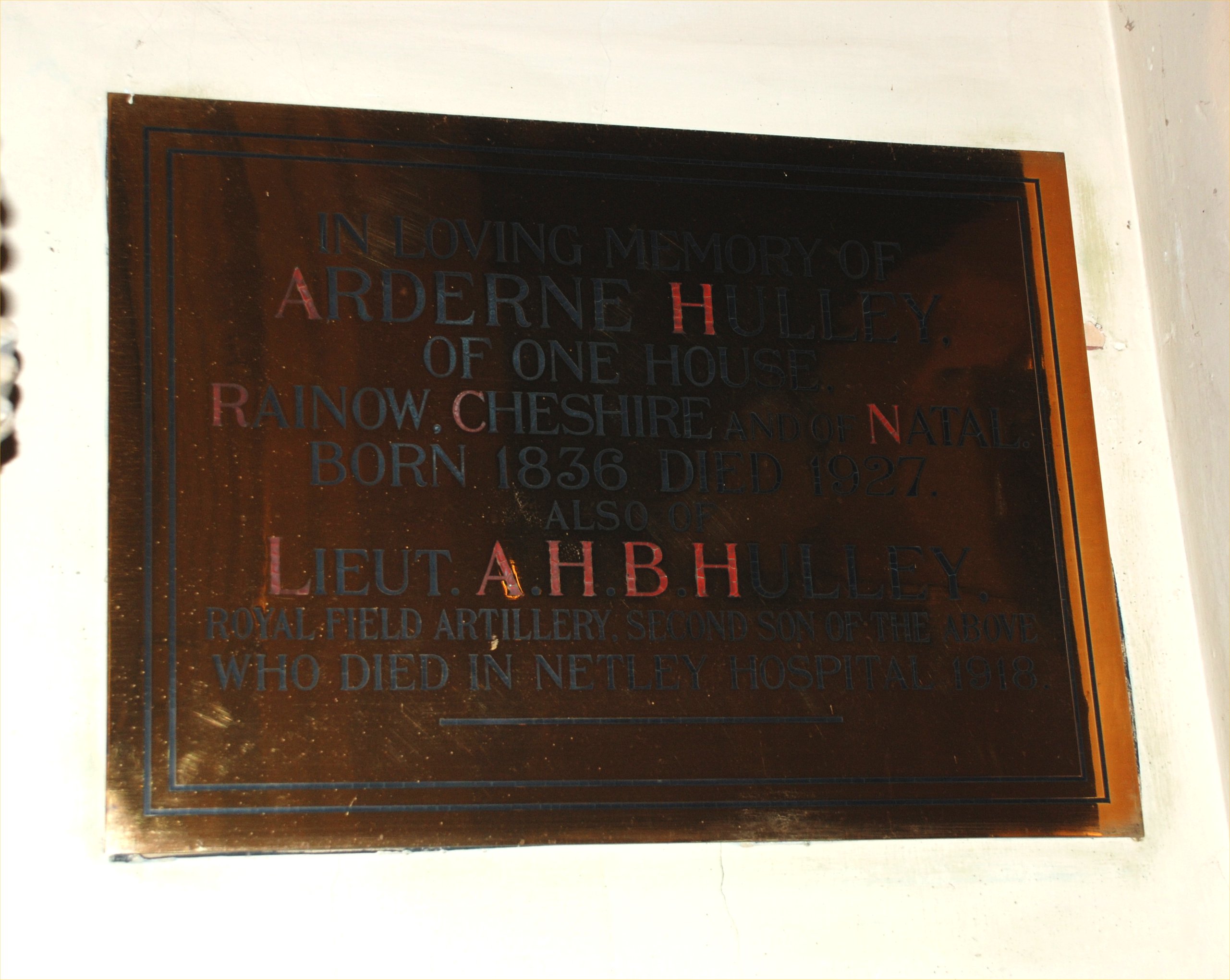 In loving memory of Arderne Hulley of One House, Rainow, Cheshire and of Natal. Born 1836 died 1927. also of Lieut. A.H.B. Hulley, Royal Field Artillery. Second son of the above who died in Netley Hospital 1918.