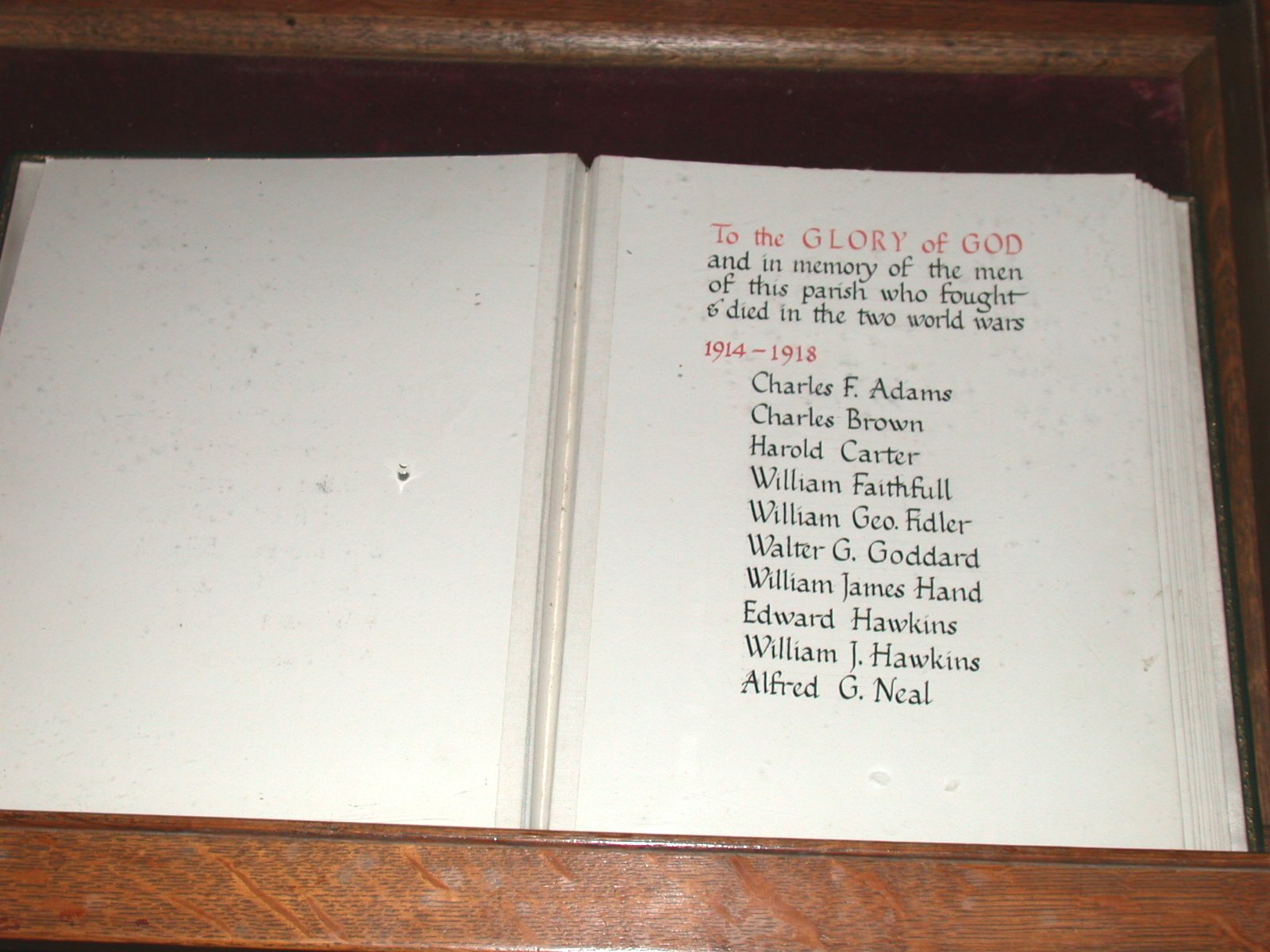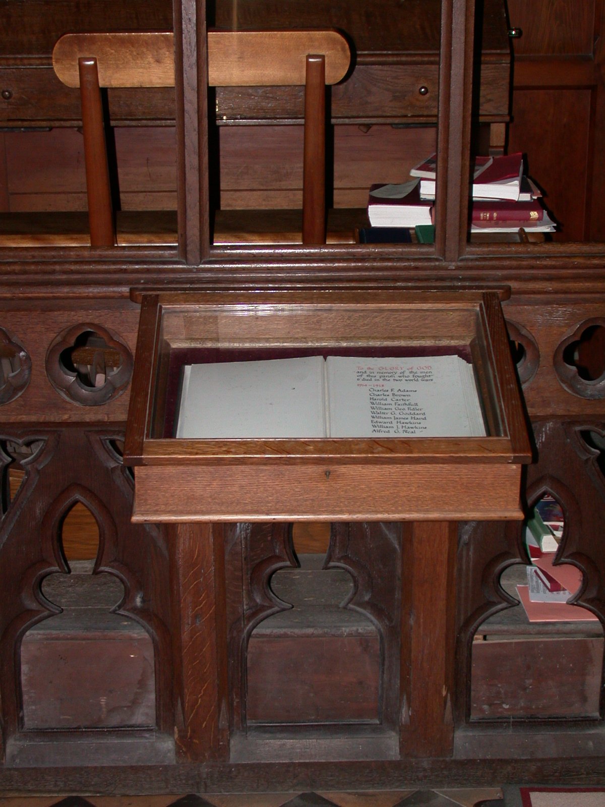 Glass case with roll of honour book inside by organ.