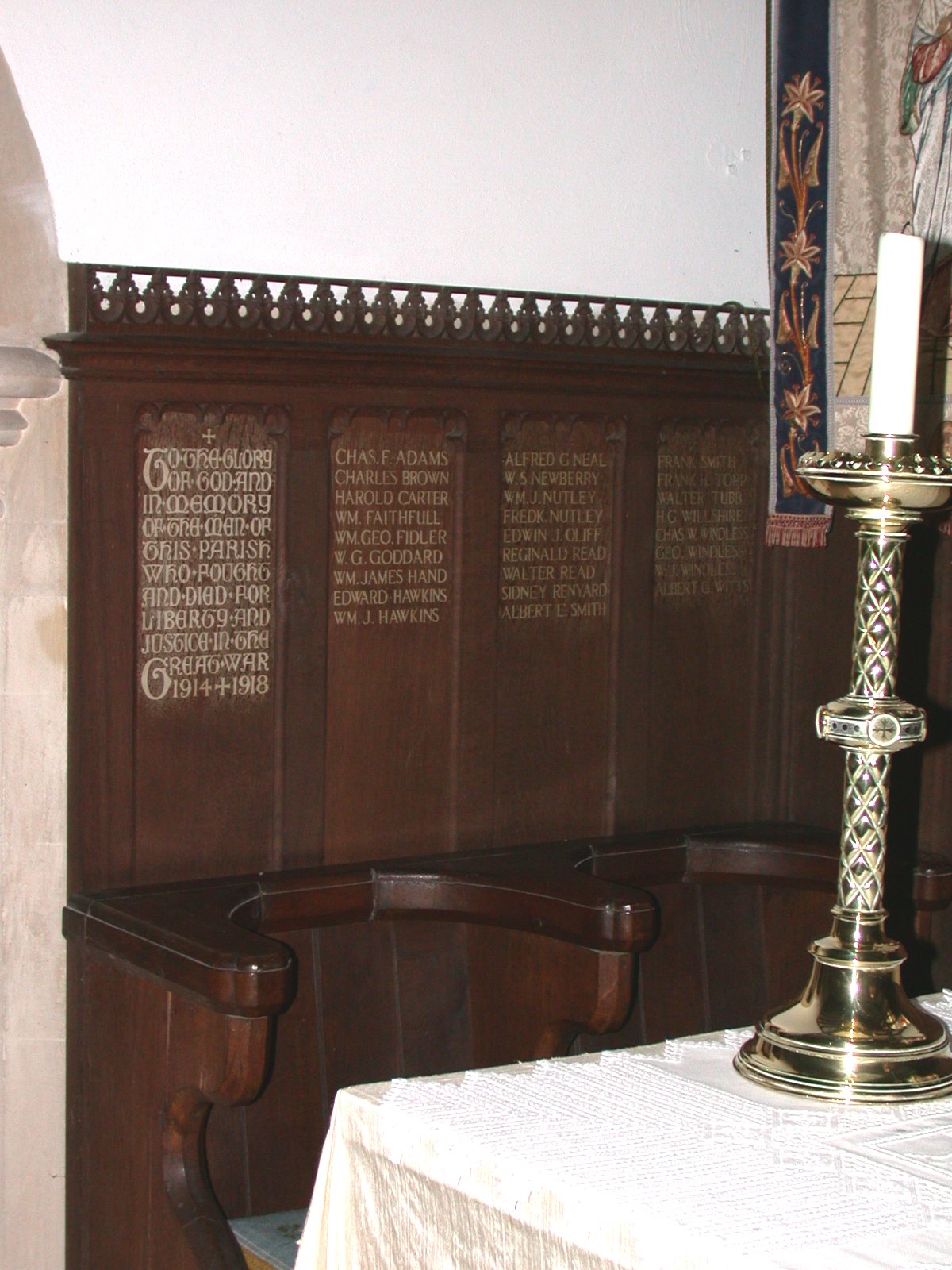 Names on wooden panelling on wall by altar in St Peter and Holy Cross Church.